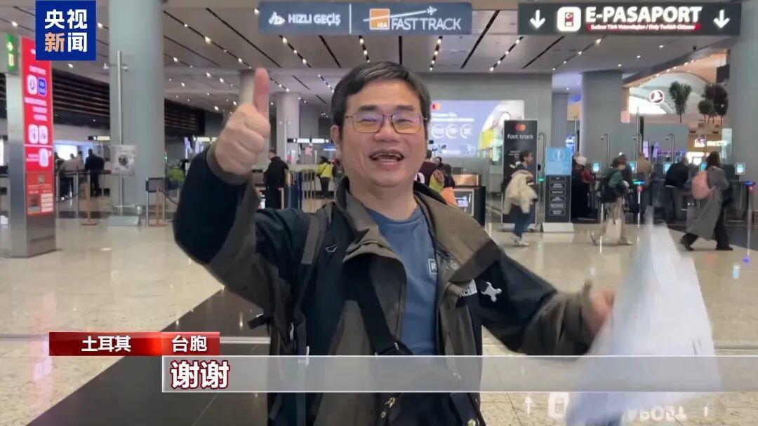 中国驻伊斯坦布尔总领馆领侨处主任 隋凯歌:这些台湾同胞是通过领保电话的渠道联系我们伊斯坦布尔总领馆。我们馆领导也是非常重视这个情况,第一时间去协调国内的有关部门,包括出入境边检,还有航司,去为他们登机做好各种各样的协调工作。